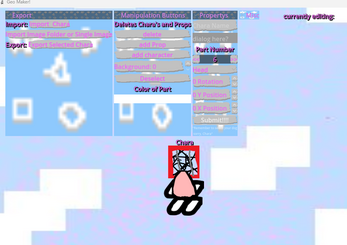 GeoMaker is a character creation / scene maker game. The entire game takes place in a singular set / stage (whatever you call it), where you make characters, move them, pose them, change backgrounds and possibly do other stuff with your own assets! (you can also place props.)