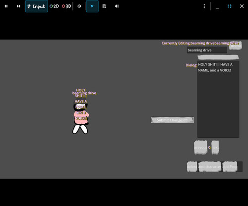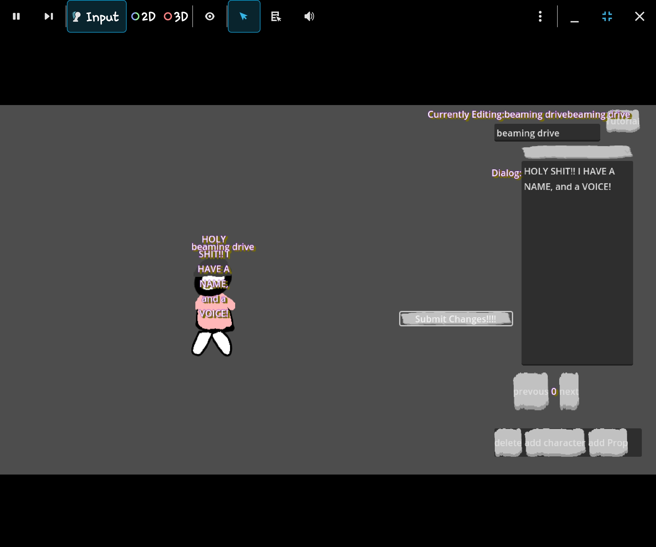Today, was busy for this project, first of all. I cleaned up some of the code and seperated image loading into global so it only loades once per game unless you hit the reload ikages button, which will reduce oberhead. Secondly, i created importing an exporting characters with the charaData reasouce, which took a bit of messing around with to work, both saving wise and loading it back in, you can niw delete whatever you select(selected prop or selected chara), the game no longer crashes when you change propertyNumber to -1 or over max folderarray, setting you back some numbers. This itself caused another bug where the first image in the folders would not appear so i fixed that. still need to fix the dialog bix to be readable, and i added sound effectets to the buttons so it wouln’t be so empty, they have grown on me despite being so chippy and retro. Otherwise, me(from 6pm till staying up till 2am on a weekend to try and finish this is an success!! All i need to do now is allow the chsnging of the stage background, allow users to put their own imsges in their own folder accessible outside the internal game files, as well as exported chara’s and possibly change the ui to be better and more good locking, with snimstions, since the sounds are fine i guess, nit the best, but fine